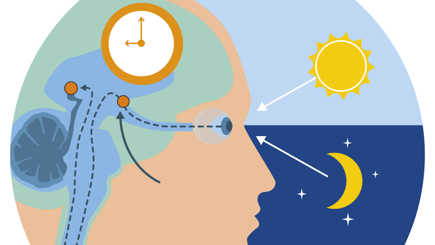 Diep in de hersenen, net boven de kruising van de oogzenuw, zit de suprachiasmatische nucleus (SCN). Dit is het onderdeel van de hypothalamus waarin de biologische klok zich bevindt. De SCN bestaat uit een paar duizend zenuwcellen die overdag actiever zijn dan ‘s nachts. Hiermee geven ze een ritmisch signaal af aan de rest van het lichaam. Op die manier coördineert de SCN de circadiane ritmes in het lichaam.
